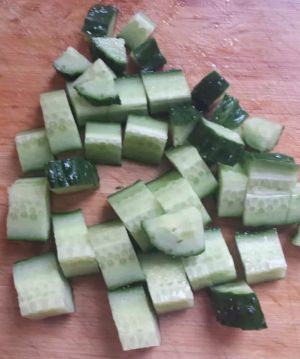 鸡胸肉切成1cm左右的方块,沥水,放入蒜泥,胡椒粉,料酒,盐少许腌制半小时以上