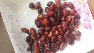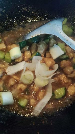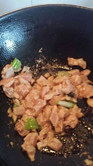 放入姜丁与辣酱,放入鸡丁炒。等鸡丁炒出汤放入糖,炒熟鸡丁后放入炸熟去皮的花生米与葱段,淋上少许红油,烹入少许香醋即可出锅