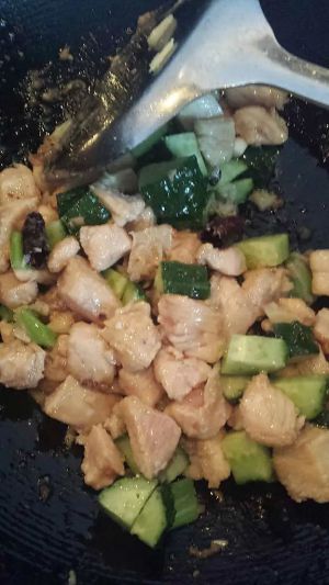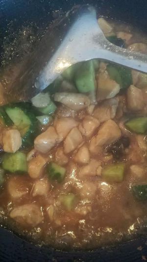 倒入提前炒好的鸡丁一同翻炒,直到鸡丁裹匀酱汁并且完全成熟后稍加勾芡并淋少许香油即可出锅