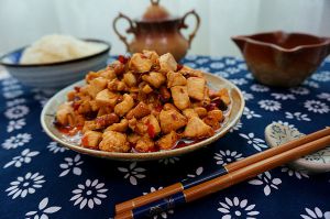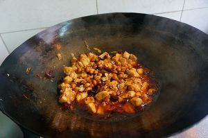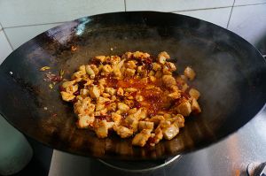 4、 热锅冷油,下京葱段、姜末、干辣椒段、花椒和1勺郫县豆瓣酱炒出香味。放入腌制好的鸡丁,煸炒至其变色