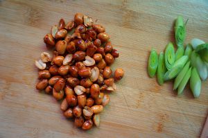 2、花生粒炸香去皮,黄瓜洗净去皮去籽切丁,京葱洗净切小段,干辣椒剪段去籽,姜切末,备用。