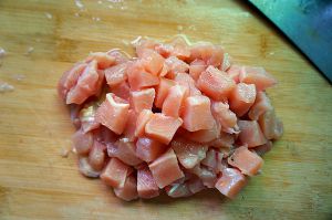鸡胸肉解冻好用温水清洗干净,然后切成均匀的小丁备用,注意哦块切得不要太大不要太小