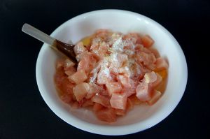 1、一块鸡胸肉洗净,切约2cm的方形小丁,加入1个蛋清、1勺料酒、1勺淀粉和半勺盐拌匀,腌制15分钟备用。