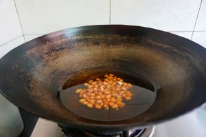 凉锅入油,冷油入花生米小火炸制八成熟捞起来沥油备用,为什么是八成熟呢因为冷了之后就很脆了,如果炸过了吃起来就有糊味儿了
