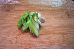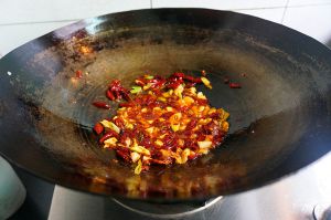 重新洗锅上油,放入干辣椒,大蒜苗段爆香,然后加入豆瓣酱继续炒出红油