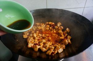 再倒入之前调好的酱汁儿,继续翻炒,直到酱汁完全裹住鸡丁,再加入少许水淀粉勾芡