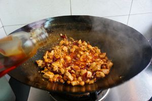黄瓜和芹菜断生后,迅速加入炒好的鸡丁和花生。翻炒片刻加入少许的盐,料酒,糖,花椒粉,五香粉,调好的生粉等调料。开大火翻炒然后起锅