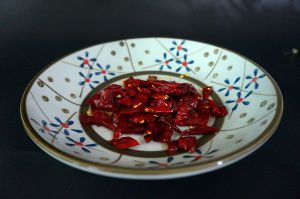 干辣椒剪小段去籽,过冷水一下,等下炒的时候不容易糊