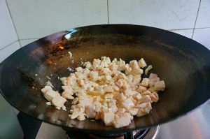 锅烧热,下入适量油,待油烧制冒烟时,放入提前腌制好的鸡肉丁翻炒均匀,滑炒熟透,将炒熟的鸡丁盛出来备用