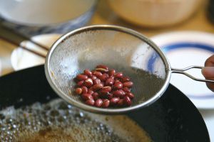 炒锅中倒入油烧热后放入花生炸熟, 盛出沥油。* 也可以用少量的油翻炒至花生全熟。* 炸花生的油量平与花生即可,无须没过花生。