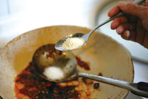炒锅内留少量的油,依次放入干辣椒段、蒜片、豆瓣酱、老抽、糖和鸡精,翻炒煸香。
