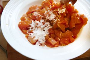 鸡肉中撒入淀粉,加少量清水抓匀。