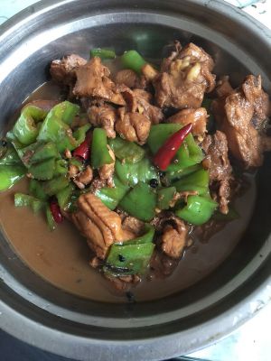 锅内留底油把生姜、大蒜、花椒爆香(注意花椒不要糊了),然后放入青椒爆炒。最后倒入鸡肉,翻炒几分钟,最后放少量生抽和老抽调味。