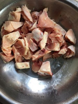 去骨鸡大腿,切块儿,大约1.5cm吧!(骨头可以留下煮汤)