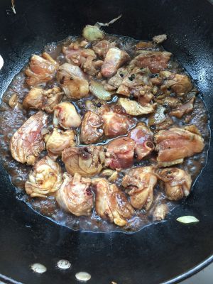 锅内加入适量花椒和花生油,待花椒变黑放入葱姜爆锅,加入鸡腿快速翻炒。鸡肉变色后倒入适量老抽或者黄豆酱油,继续翻炒