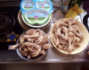 鸡爪洗净剪好指甲,清水烧开后洗净再烧,共三次