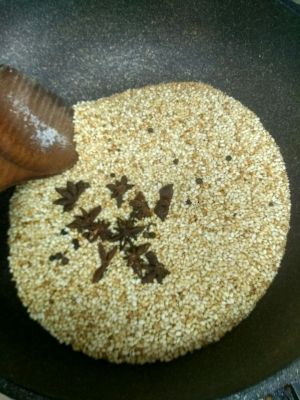 将花椒八角和大米糯米一起小火干炒,适当放点盐到米变金黄色为止,大约20分钟