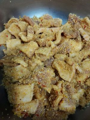 将炒熟米粉趁热拌入腌好的五花肉