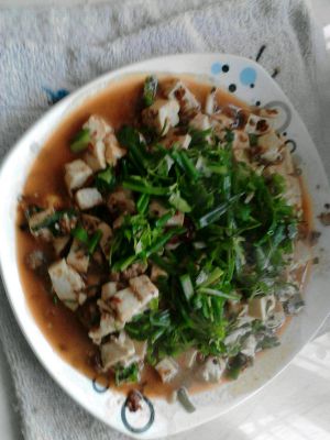 最后加入清水下入豆腐(没过豆腐三分之二)l 开始调味下入耗油、生抽,盐,鸡精,胡椒粉(全部适量) 煮开后二三分钟后开始勾芡 (加入适量淀粉和水搅拌,水淀粉浓度要浓浓一点) 把火开小,均匀撒上水淀粉,用锅铲轻轻推动豆腐 起锅前加入蒜苗即可装盘