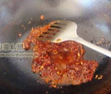 放入辣豆瓣酱翻炒至出红油。