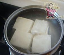 豆腐下锅淖水,加入少许盐 煮开后倒出用冷水过凉