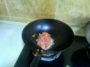 锅中注入植物油,热锅下油,微热后小火下猪肉翻炒至变色,盛出备用