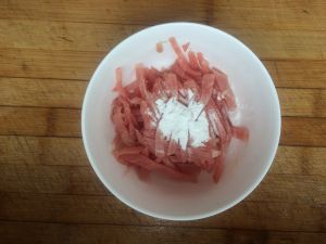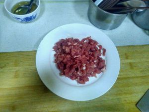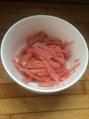 瘦肉切丝。ps:在冰箱稍微冷冻肉容易切丝。