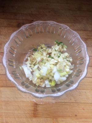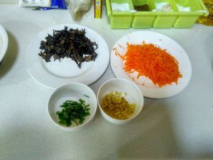 木耳提前用温水泡开,木耳胡萝卜切丝,姜蒜切沫,葱花单独放一个碗里。