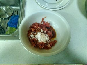 加入一勺淀粉和一勺生抽,用筷子搅拌均匀,确保淀粉粘在肉丝上。