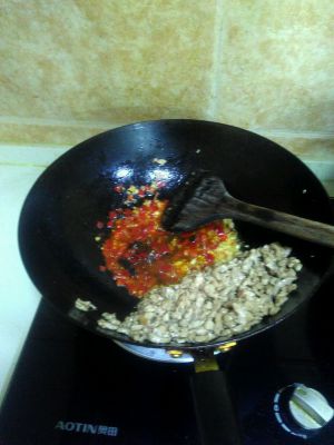 将肉丝尽量弄到一边,放入姜蒜沫爆锅,之后放入适量豆瓣酱和剁椒酱与肉丝进行翻炒。