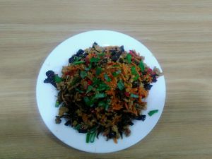 之后放入木耳和胡萝卜丝,翻炒几下后装盘,撒上葱花就可以出锅啦!