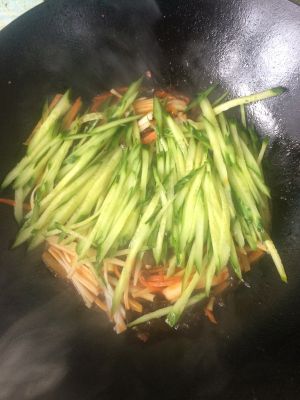 最后清水笋丝和黄瓜丝全放进去,大火翻炒,能掂勺的弄俩下。
