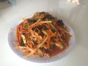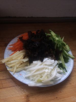 清水笋丝是成品的,葱白,黄瓜,胡萝卜及木耳纷纷切丝。