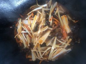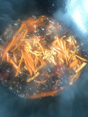 开中火,放入胡萝卜丝和木耳丝翻炒1-2分钟