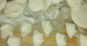 面粉制作发面,切成大丁,然后擀面皮