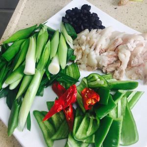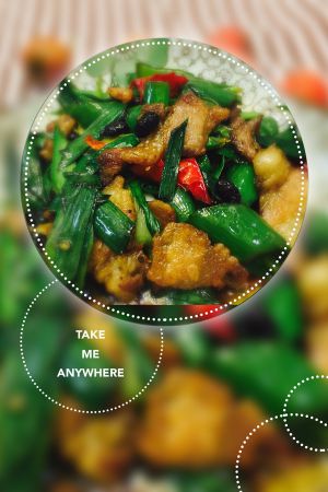 依顺放入青椒,红椒,蒜苗翻炒片刻后加入适量盐和生抽翻炒均匀即可