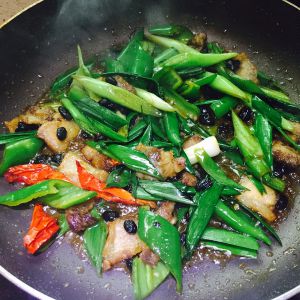 放入小米椒和湖南椒翻炒片刻后放入青蒜苗一起炒熟。
