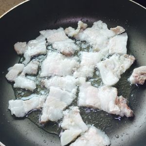把煮熟的五花肉捞出来凉下切薄片。越薄越好。锅里放油,把肉片放进去炒炸一会儿。注重卖相的亲可以放点郫县豆瓣酱。