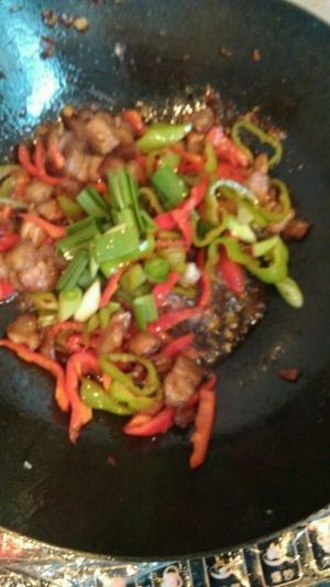 放入切好的青椒和芹菜翻炒,要起锅时再放入少许葱。