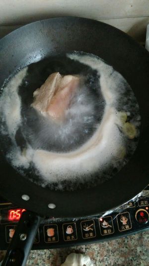 把五花肉放入凉水锅煮到八成熟,放入姜片若干