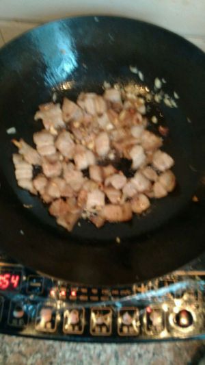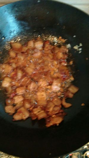 五花肉下锅爆炒,多炒会,让肉有些酥酥的,放一点点糖