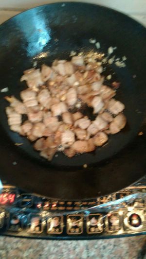 炒锅开小小火,放入相对比较肥的肉爆出油后,加所有的肉一起爆30秒
