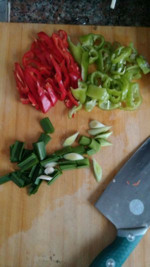 洋葱、青椒、红椒,切大小一致的小块,所有的配料准备好备用