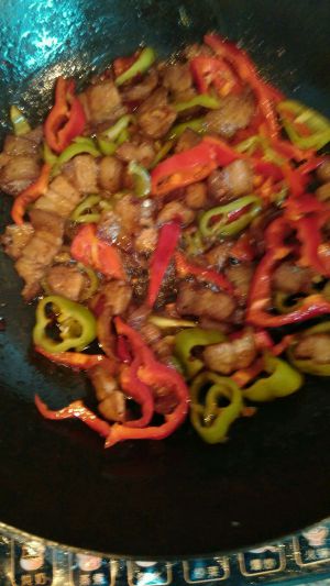 五花肉焯水,煮熟,这里我我是事先煮好放冰箱里的,所以用的现成的,将煮熟的五花肉切片,青椒切块