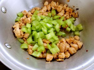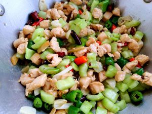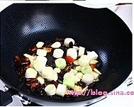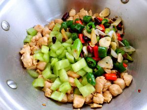 煸炒出香味后加入腌好的鸡丁翻炒;