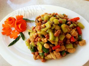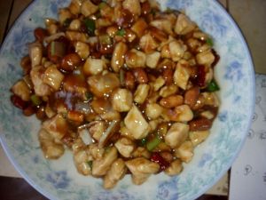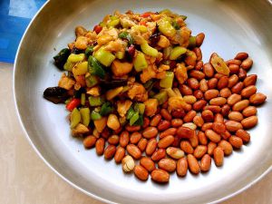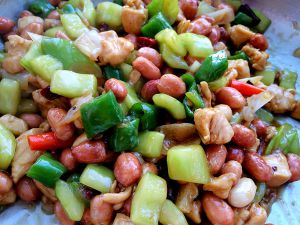 待鸡丁扁白时,把鸡丁扒拉到一边,锅底放花椒和红干椒扁香,再放祘片和葱花,翻炒几下,加入花生米,再加入碗汁翻炒出锅。
