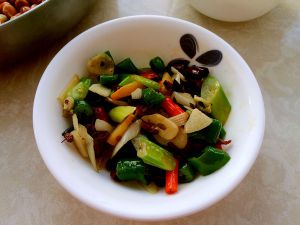 放入鸡丁,青红椒粒,翻炒均匀后倒入调好的料汁。大火翻炒均匀后,再倒入花生米翻炒均匀后出锅。