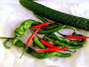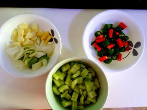 黄瓜去皮去籽切丁,尖椒切段,葱姜蒜切好