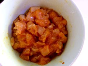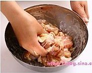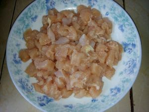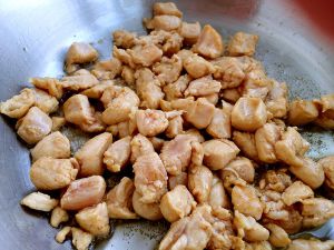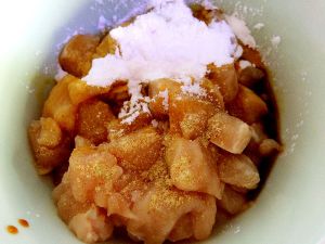 将鸡腿肉切成小丁, 加入盐, 生粉和料酒等调味料, 搅拌均匀后腌制一下;