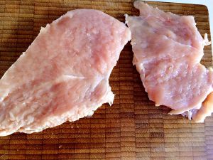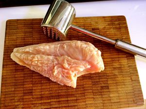 鸡胸脯从中间切开,用肉锤砸一砸,只是松松肉,不要砸的太薄
